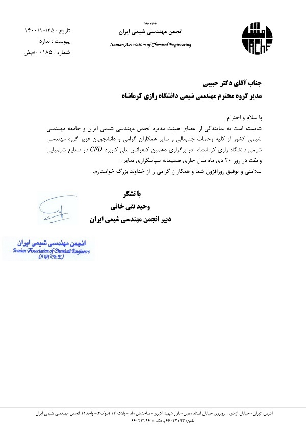 دکتر حبیبی اظهار داشت: «دهمین کنفرانس ملی کاربرد CFD در صنایع شیمیایی و نفت» در مورخ 1400/10/20 به صورت مجازی، به میزبانی دانشگاه رازی، به همّت گروه مهندسی شیمی و با همکاری انجمن مهندسی شیمی ایران برگزار شد.