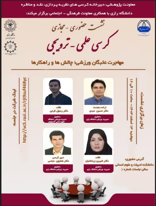 جلسه کرسی علمی – ترویجی دانشگاه رازی با عنوان "مهاجرت نخبگان ورزشی: چالشها و راهکارها" برگزار شد.