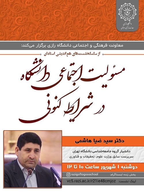 معاونت فرهنگی و اجتماعی دانشگاه رازی از سلسلهنشستهای هماندیشی استادان دانشگاه، جلسهای را باعنوان «مسئولیت اجتماعی دانشگاه در شرایط کنونی» با سخنرانی آقای دکتر سیدضیاء هاشمی دانشیار گروه جامعهشناسی دانشگاه تهران و سرپرست سابق وزارت علوم، تحقیقات و فناوری به صورت مجازی با حضور اعضای هیئت علمی دانشگاههای استان برگزار مینماید.