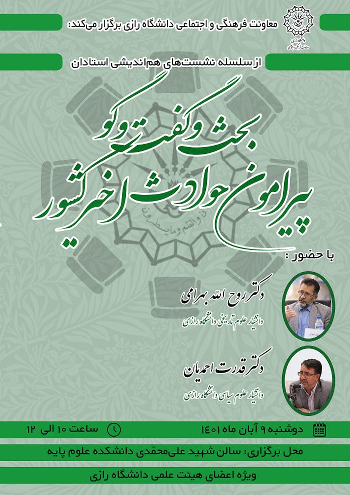 نشست هماندیشی استادان با موضوع: بحث و گفتگو پیرامون حوادث اخیر کشور با سخنرانی دکتر روحاله بهرامی (دانشیار علوم تاریخی دانشگاه رازی) و دکتر قدرت احمدیان (دانشیار علوم سیاسی دانشگاه رازی) برگزار میشود.