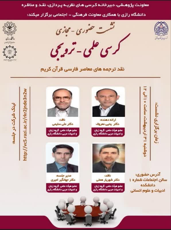 جلسه کرسی علمی ترویجی با عنوان «نقد ترجمه‌های معاصر فارسی قرآن کریم» به صورت وبیناری با حضور جمعی از اعضای هیئت علمی و دانشجویان دانشگاه رازی آغاز شد.