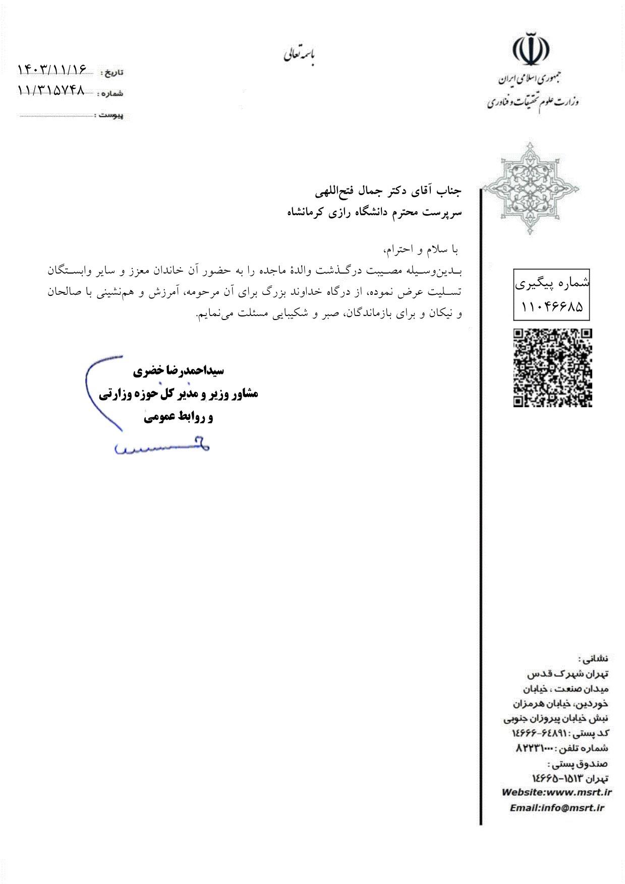 مشاور وزیر و مدیر کل حوزه وزارتی و روابط عمومی وزارت عتف با صدور پیامی، درگذشت مادر گرامی سرپرست دانشگاه رازی را تسلیت گفت.