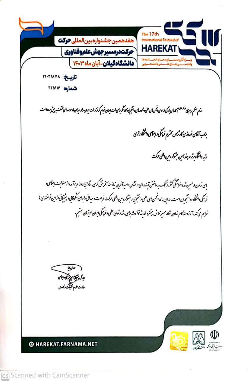 به گزارش روابط عمومی دانشگاه رازی، در هفدهمین جشنواره بینالمللی حرکت که مورخ 19 الی 22 آبان ماه 1403 با حضور بیش از 104 دانشگاه کشور به میزبان دانشگاه گیلان در شهر رشت برگزار شد.