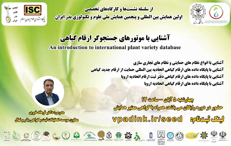 در راستای سلسله نشستها و کارگاههای تخصصی اولین همایش بین المللی و پنجمین همایش ملی علوم و تکنولوژی بذر ایران، اولین کارگاه با عنوان "آشنایی با موتورهای جستجوگر ارقام گیاهی" روز چهارشنبه ۵ آبان ساعت ۱۷ دکتر فرهاد خیری معاون موسسه تحقیقات ثبت و گواهی بذر و نهال برگزار میشود.