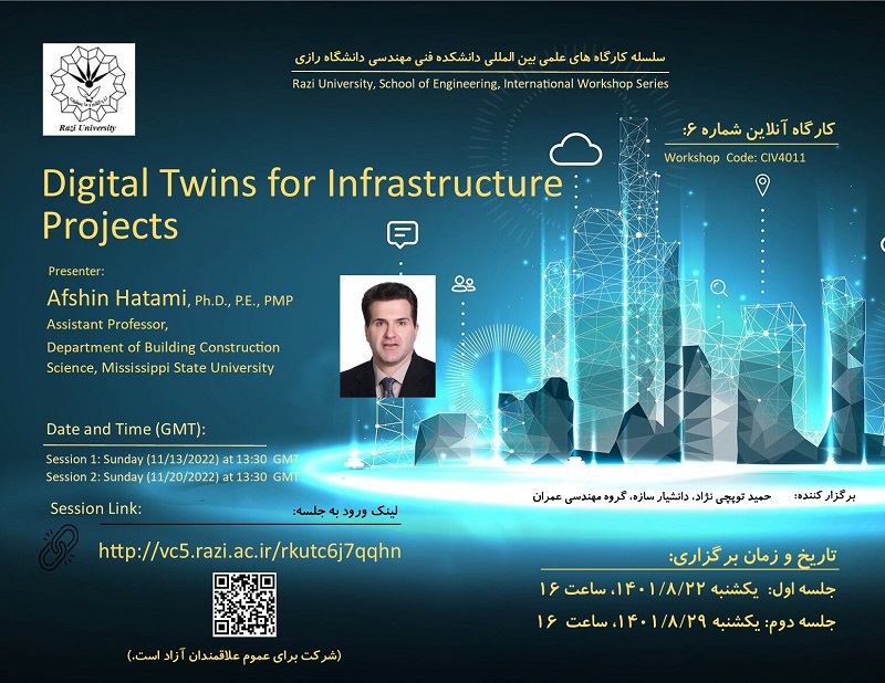 در راستای همکاریهای علمی و بینالمللی دانشکده فنی و مهندسی دانشگاه رازی، کارگاه آموزشی دو روزه با عنوان: Digital Twins for Infrastructure Projects توسط گروه مهندسی عمران، با حضور دکتر افشین حاتمی استادیار دانشگاه ایالتی می سی سی پی در روزهای 22 و 29 آبان ماه 1401 رأس ساعت 16 بهصورت مجازی برگزار میشود.