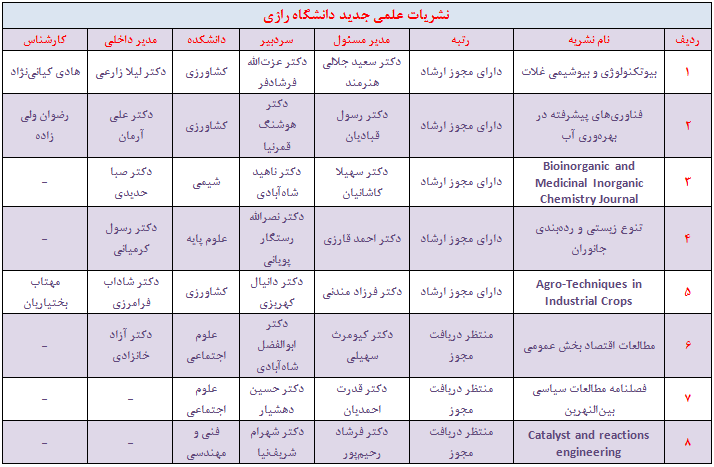 به گزارش روابط عمومی دانشگاه رازی، کارگاه آموزشی و جلسه هماهنگی در رابطه با شروع به فعالیت و نمایهسازی نشریات علمی جدید دانشگاه، 24 خرداد 1400، به صورت مجازی با حضور دکتر علیاکبر زینتیزاده مدیر مسئول نشریه Journal of Applied Research in Water and Wastewater و دارای رتبه الف و دکتر علیرضا نوروزی دانشیار دانشگاه تهران و متخصص نمایهسازی نشریات برگزار گردید.