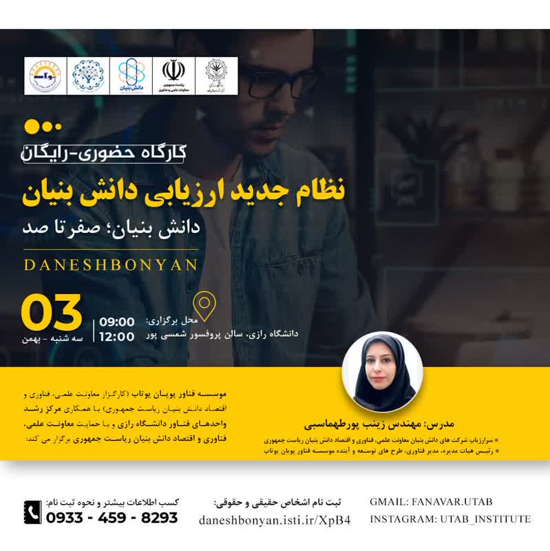 کارگاه "نظام جدید ارزیابی دانش بنیان؛ صفر تا صد" در روز سه شنبه ساعت 9 الی 12 مورخ سوم بهمن ماه 1402 در محل سالن آمفی تئاتر پروفسور شمسی پور ساختمان کتابخانه مرکزی برگزار میشود.