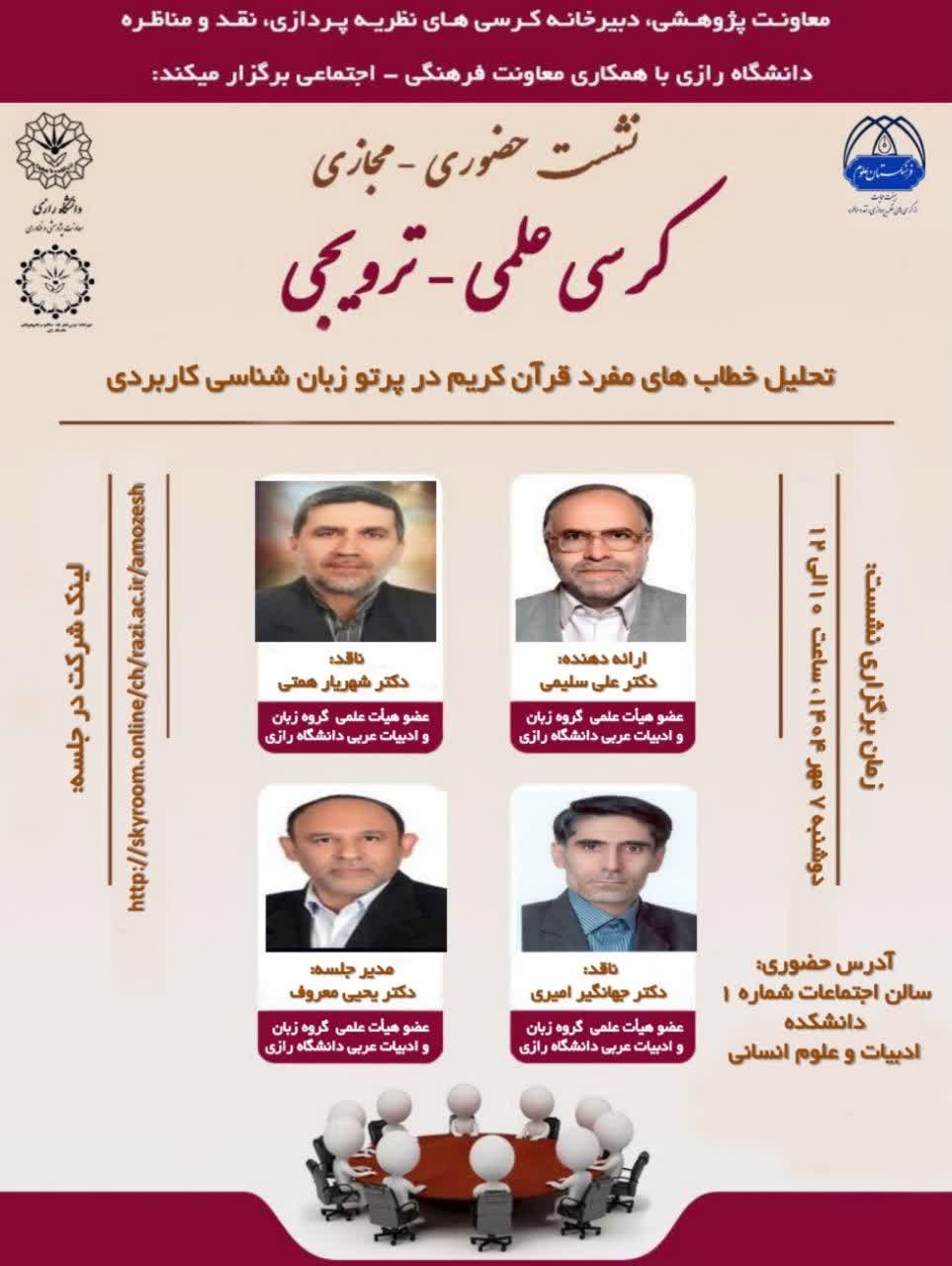 نشست کرسی علمی – ترویجی با عنوان «تحلیل خطابهای مفرد قرآن کریم در پرتو زبان شناسی کاربردی» با ارائه دکتر علی سلیمی عضو هیات علمی دانشگاه رازی، روز دوشنبه 7 مهر ماه 1404 ساعت 10 الی 12 به صورت حضوری و مجازی برگزار می گردد.