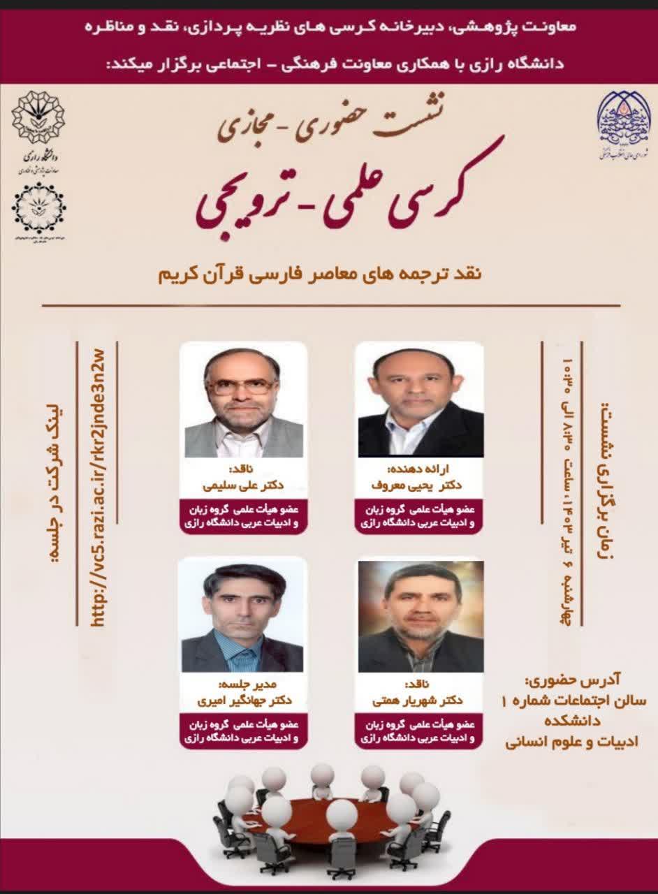کرسی علمی – ترویجی با موضوع: " نقد ترجمه های معاصر فارسی قرآن کریم" توسط معاونت پژوهشی، دبیرخانه کرسیهای نظریهپردازی، نقد و مناظره دانشگاه رازی با همکاری معاونت فرهنگی - اجتماعی برگزار میشود.