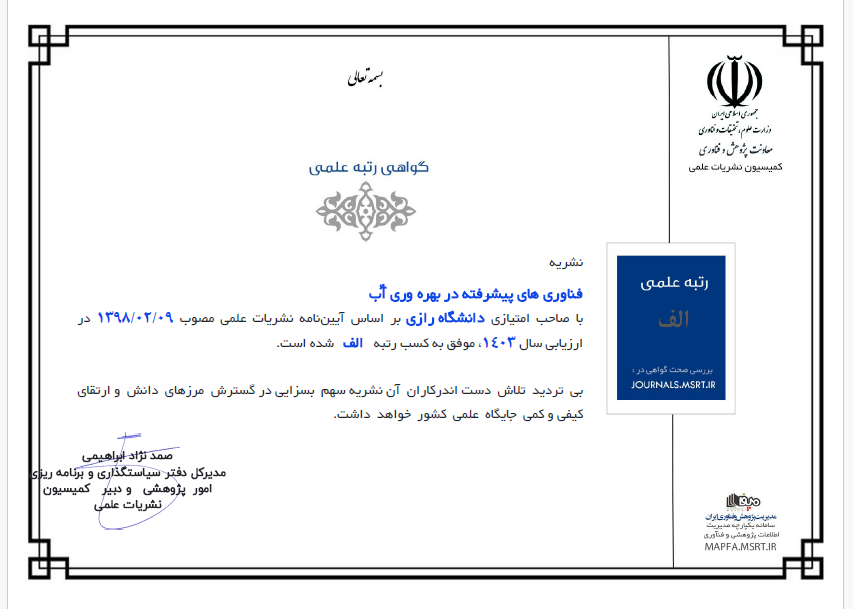 کسب رتبه "الف" نشریه فناوریهای پیشرفته در بهرهوری آب توسط کمیسیون نشریات علمی وزارت علوم، تحقيقات و فناوري - پرتال اصلی دانشگاه رازی