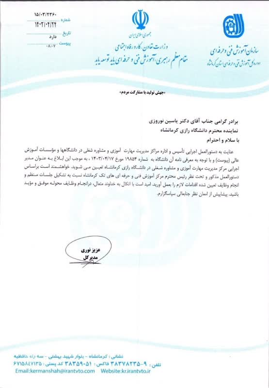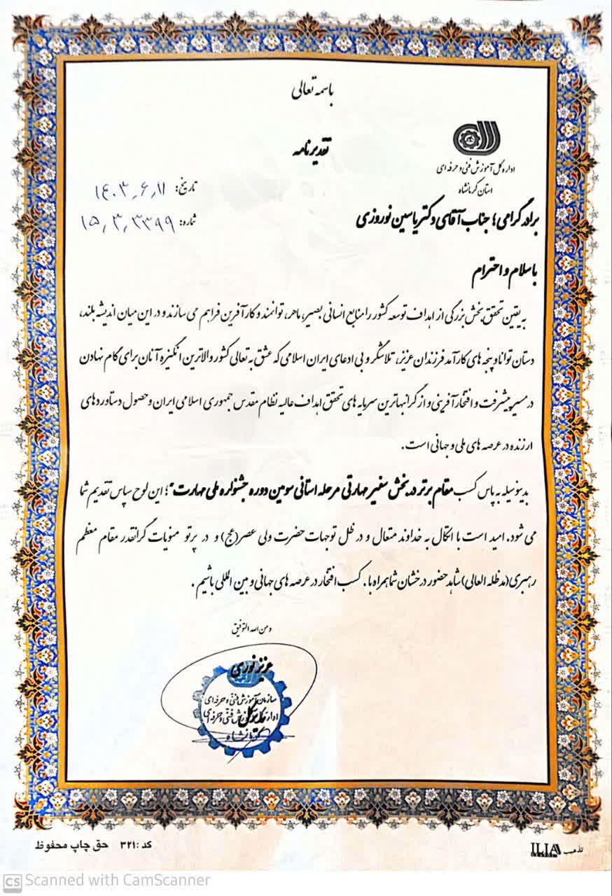 در این مراسم، دکتر یاسین نوروزی کارشناس انجمنهای علمی-دانشجویی دانشگاه رازی در مرحله استانی بخش سفیر مهارت، سومین جشنواره ملی مهارت موفق به کسب مقام برگزیده استان شد.
