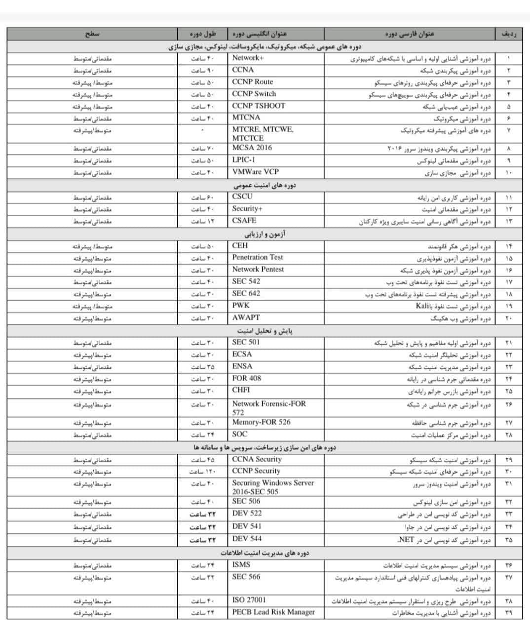 دکتر جهانگیری با اشاره به برگزاری دورههای آموزشی امنیت شبکه و امنیت وب یادآور شد: مرکز تخصصی آپا دانشگاه رازی دورههای آموزشی متعددی با هدف توانمندسازی کارکنان واحدهای IT سازمانها و دانشجویان برگزار نموده است. در ادامه لیستی از دورههای برگزار شده ارائه میگردد.