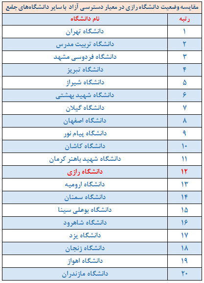 ایشان بیان کرد: برای سومین سال متوالی دانشگاه رازی موفق شده است در این نظام رتبهبندی معتبر قرار گیرد، از بین 36 دانشگاه کشور که در نظام رتبهبندی لایدن قرار گرفتهاند 20 دانشگاه کشور در رده دانشگاههای جامع هستند که عبارتند از: دانشگاه تهران، تربیت مدرس، فردوسی مشهد، شیراز، تبریز، شهید بهشتی، گیلان، کاشان، اصفهان، رازی، سمنان، شهید باهنر کرمان، ارومیه، پیام نور، بوعلی سینا ، شاهرود و شهید چمران اهواز، زنجان، مازندران و یزد .
