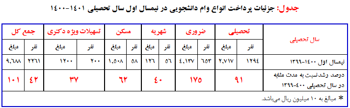 ¯ وام تحصیلی: 1294 نفر از دانشجویان متقاضی دریافت این وام بودند و با تایید سایر درخواستها، مبلغ 27 ميليارد ريال به این دانشجویان پرداخت شد. اختصاص اين وام به دانشجويان متقاضي نسبت به نيمسال مشابه در سال تحصيلي 400-1399 حدود 91 درصد رشد داشت.