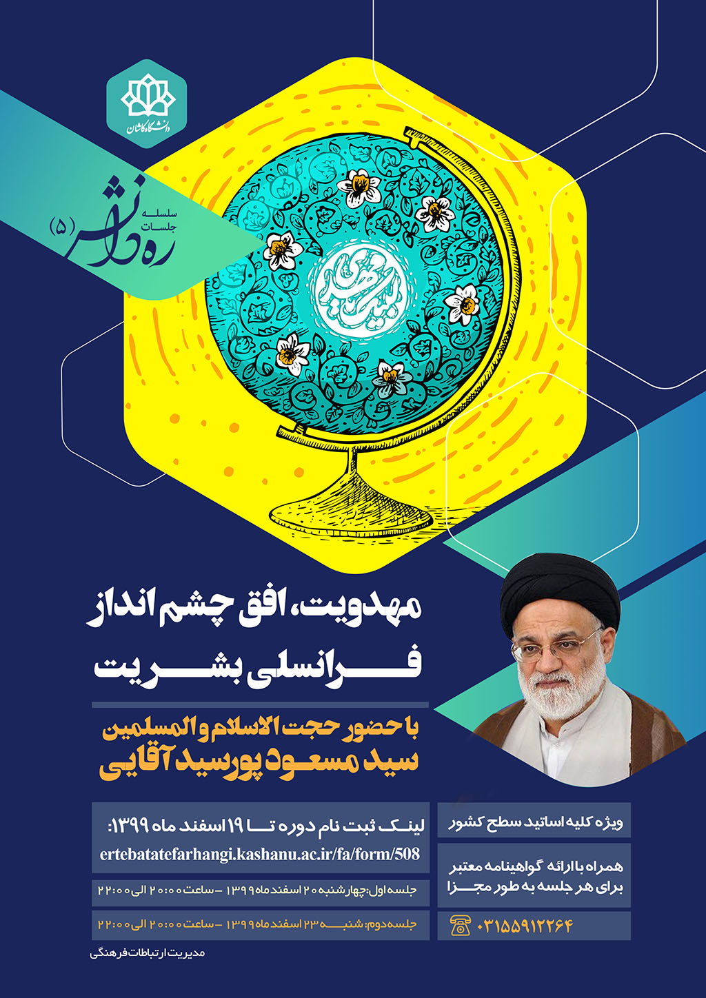 مدیریت ارتباطات فرهنگی دانشگاه کاشان از سلسله جلسات ره دانش را با موضوع «مهدویت، افق چشم انداز فرانسلی بشریت» با تدریس حجت الاسلام و المسلمین دکتر سیدمسعود پورآقایی در روزهای چهارشنبه 20 و شنبه 23 اسفند ماه 1399 به صورت مجازی برگزار می کند.