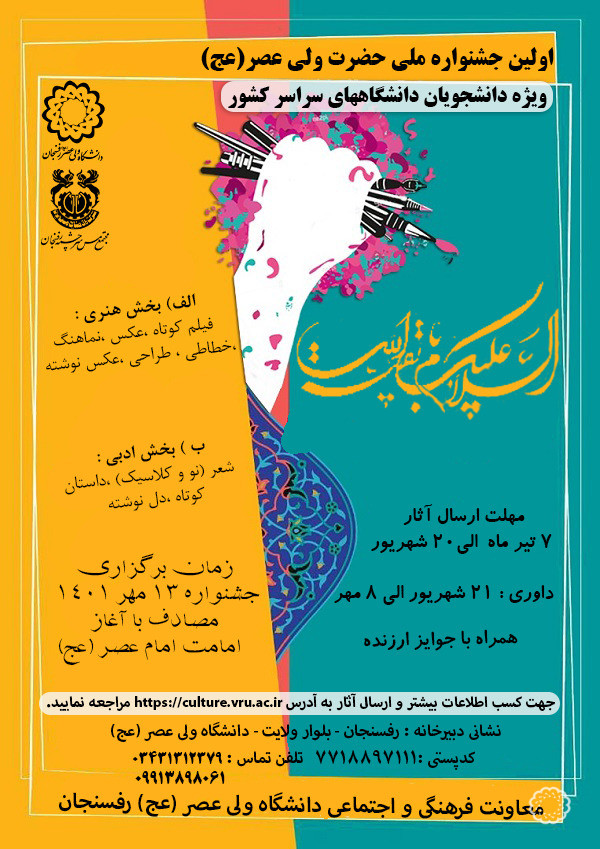 به مناسبت سالروز آغاز امامت امام زمان (عج)، اولین جشنواره ملی حضرت ولی عصر(عج) ویژه دانشجویان سراسر کشور با محوریت «دانشجو، امید و انتظار» به همت معاونت فرهنگی و اجتماعی دانشگاه ولی عصر(عج) رفسنجان برگزار می گردد.