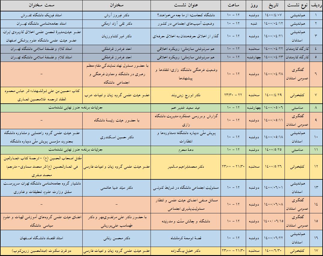 برنامۀ برخی از نشستهای معاونت فرهنگی و اجتماعی دانشگاه رازی در فصل تابستان در قالب پنج دستۀ زیر: