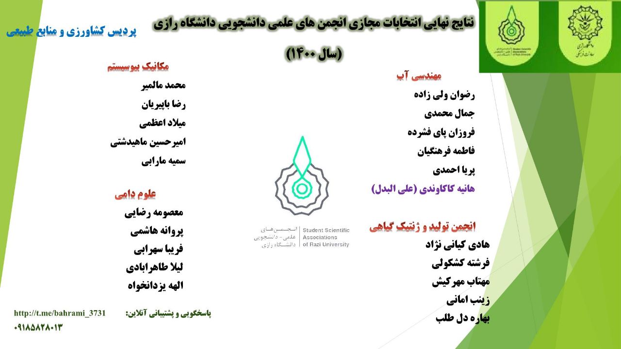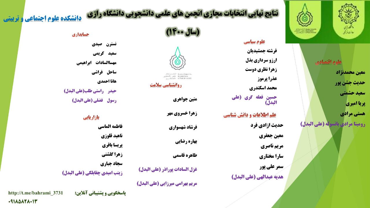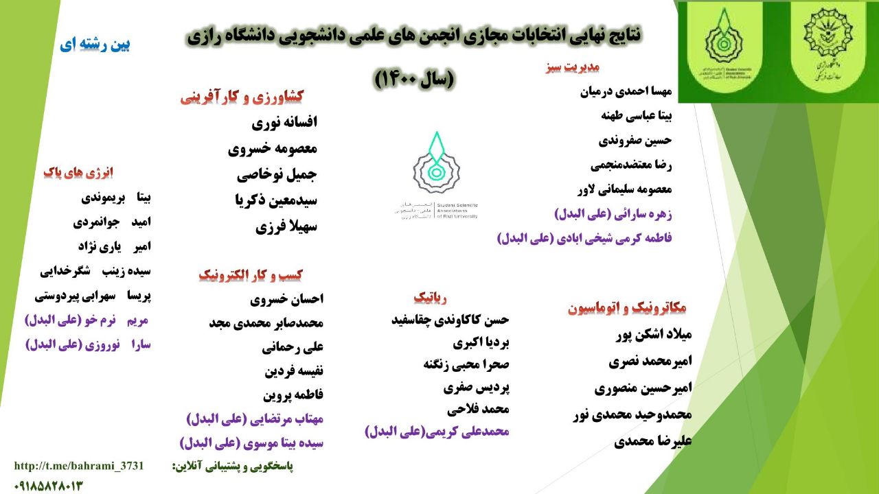 نتایج نهایی انتخابات شورای مرکزی انجمنهای علمی دانشجویی دانشگاه رازی به شرح ذیل اعلام میشود: