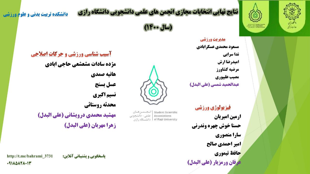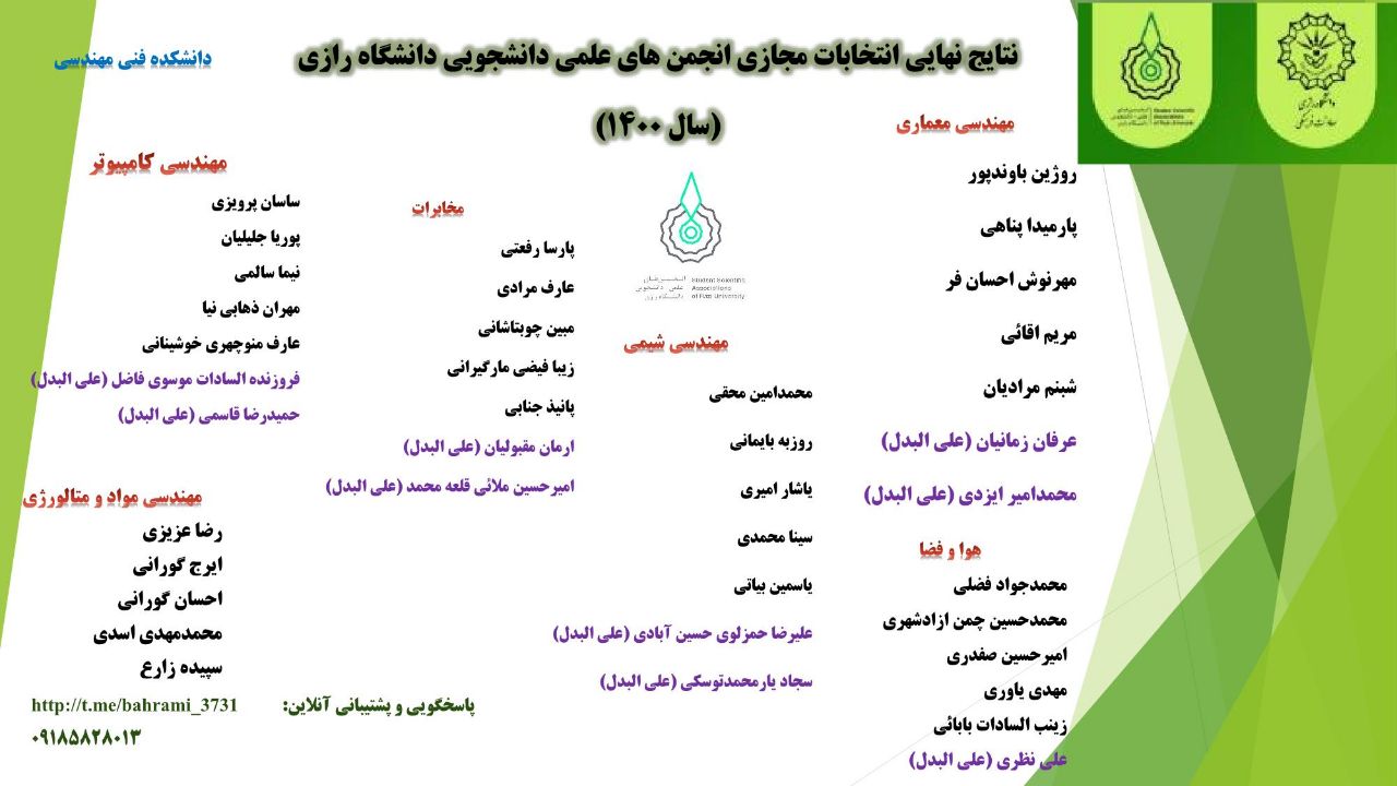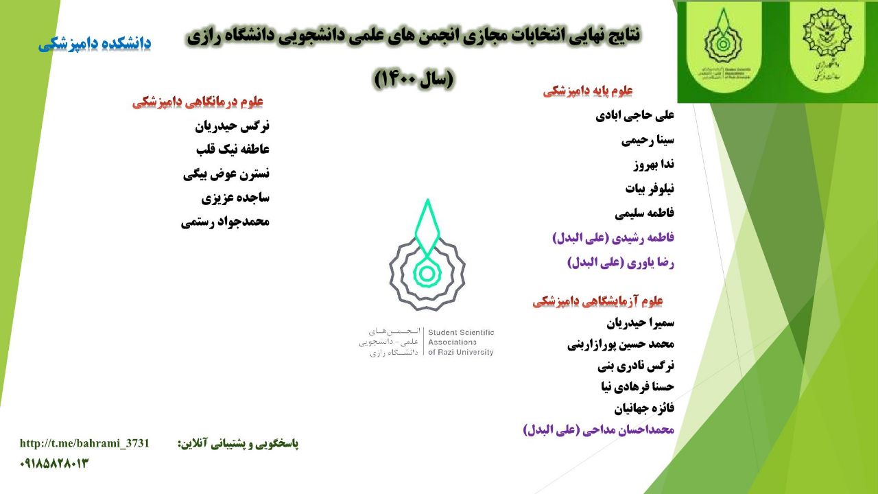 انتخابات انجمنهای علمیدانشجویی دانشگاه رازی روز پنجشنبه 3 تیرماه 1400 بهصورت مشترک و در بستر سامانۀ جامع امورفرهنگی با شرکت 1442 نفر از دانشجویان دانشکدههای فنی و مهندسی، ادبیات و علوم انسانی، علوم اجتماعی و تربیتی، علوم پایه، علوم ورزشی و تربیت بدنی، شیمی و پردیس کشاورزی و منابع طبیعی برگزار شد که در مجموع تعداد 3939 رأی أخذ گردید.