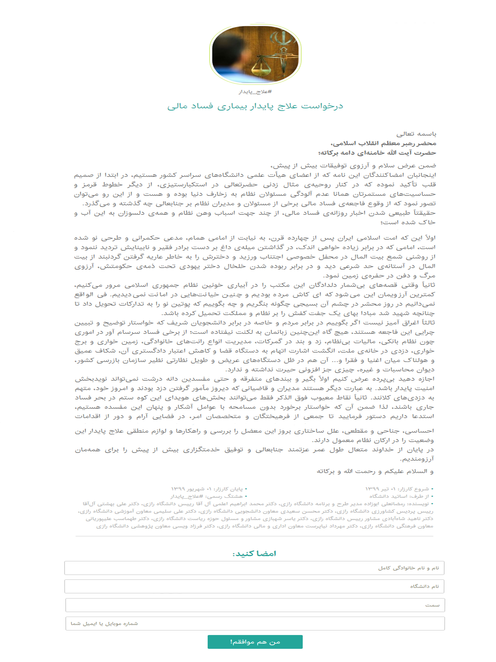 در هفتۀ گذشته نامه ای با امضای چند نفر از استادان محترم دانشگاه رازی جهت تأیید و ارسال به محضر مقام معظم رهبری(دامت برکاته) در دسترس استادان محترم دانشگاه قرار گرفت.