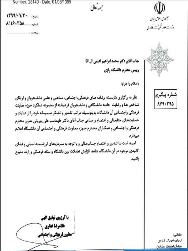 دکتر غلامرضا غفاری معاون فرهنگی و اجتماعی وزارت علوم، تحقیقات و فناوری طی نامه ای به ریاست دانشگاه رازی، مراتب تقدیر و تشکر خود را از عملکرد معاونت فرهنگی و اجتماعی دانشگاه رازی و جناب آقای دکتر طهماسب علی پوریانی ابراز داشتند.