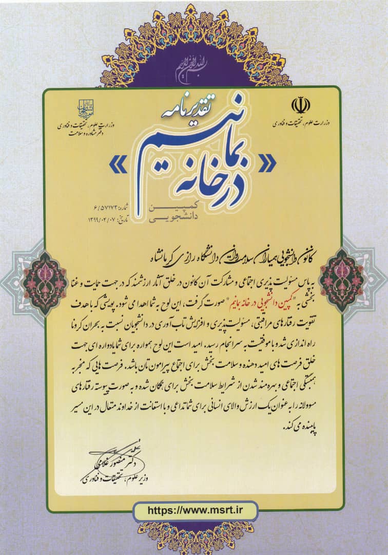 کانون همیاران سلامت دانشگاه رازی موفق به کسب عنوان برگزیده «کمپین دانشجویی درخانه بمانیم» در سطح ملی و دریافت لوح سپاس از وزیر علوم، تحقیقات و فناوری گردید.