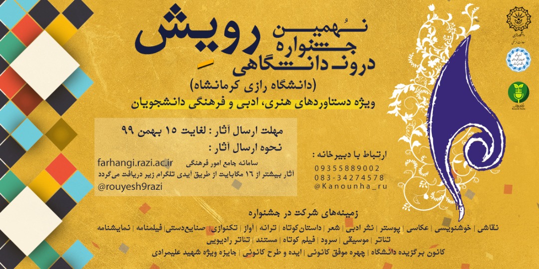 معاونت فرهنگی و اجتماعی دانشگاه رازی، «نهمین جشنواره درون دانشگاهی رویش» را ویژۀ آثار و توانمندیهای هنری، ادبی و فرهنگی دانشجویان و کانون های فرهنگی دانشگاه رازی برگزار میکند: