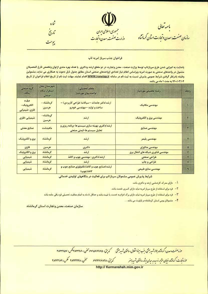 نظر به اجرایی شدن طرح سربازتاپ توسط وزارت صنعت، معدن و تجارت در دو مقطع ارشد و دکتری به منظور بهرهمندی از توان علمی و پژوهشی سربازان وظیفه در واحدهای صنعتی به صورت امریه، نیازهای صنعت استان کرمانشاه در جذب سربازتاپ (مختص فارغالتحصیلان مشمول) مطابق اطلاعیه ذیل اعلام میگردد.