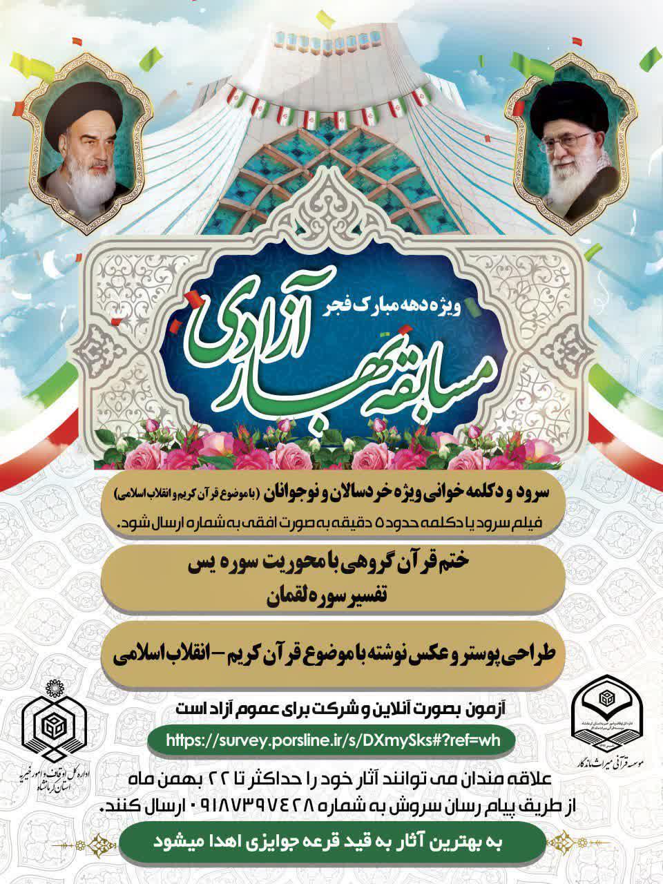 به مناسبت چهل و سومین سالگرد پیروزی انقلاب اسلامی ایران، اداره کل اوقاف و امورخیریۀ استان کرمانشاه مسابقۀ «بهار آزادی» را برگزار می کند.
