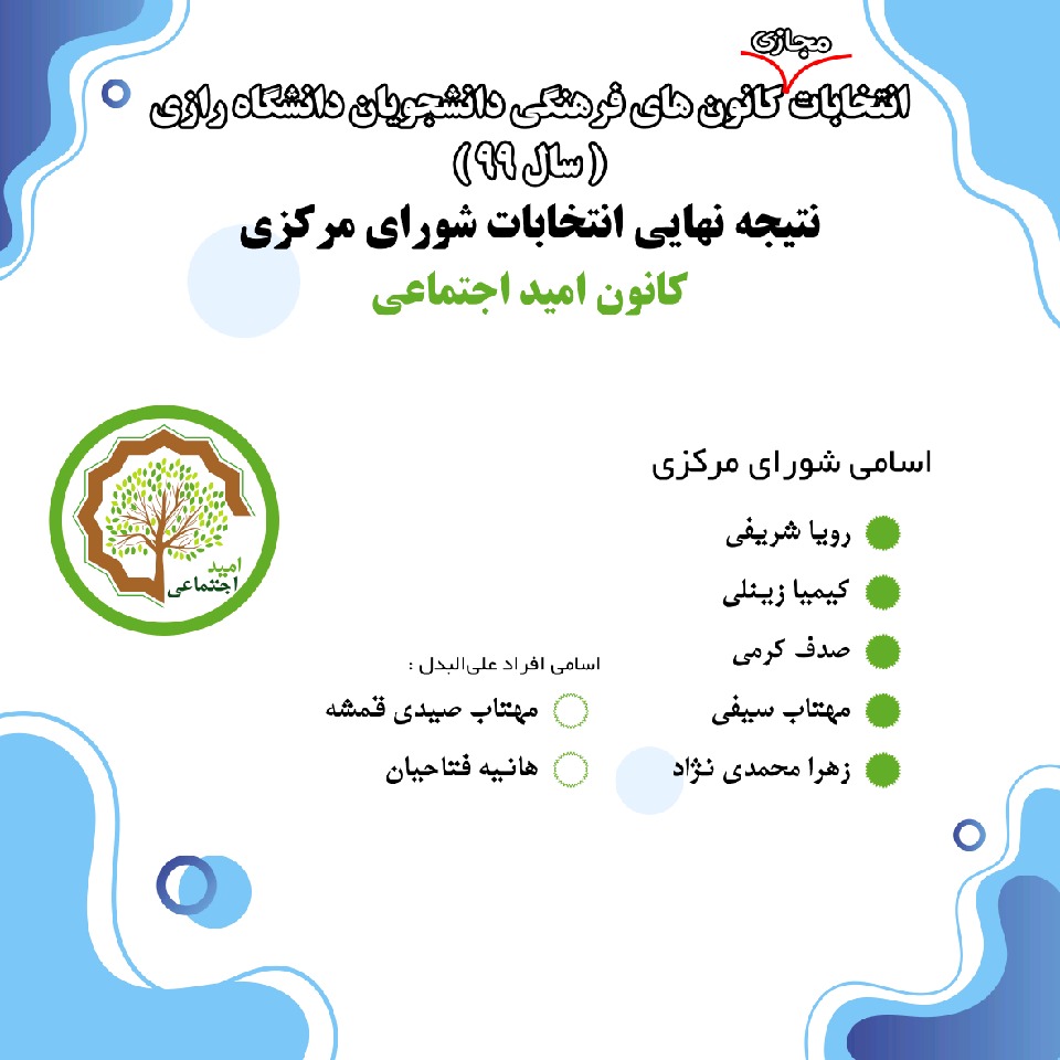 نتیجۀ نهایی انتخابات شورای مرکزی کانون امید اجتماعی که در تاریخ ۱۳۹۹/۷/۲۰ از ساعت ۸ الی ۱۴ به صورت مجازی در سامانۀ جامع امورفرهنگی دانشگاه رازی برگزار شد به شرح ذیل اعلام می شود.
