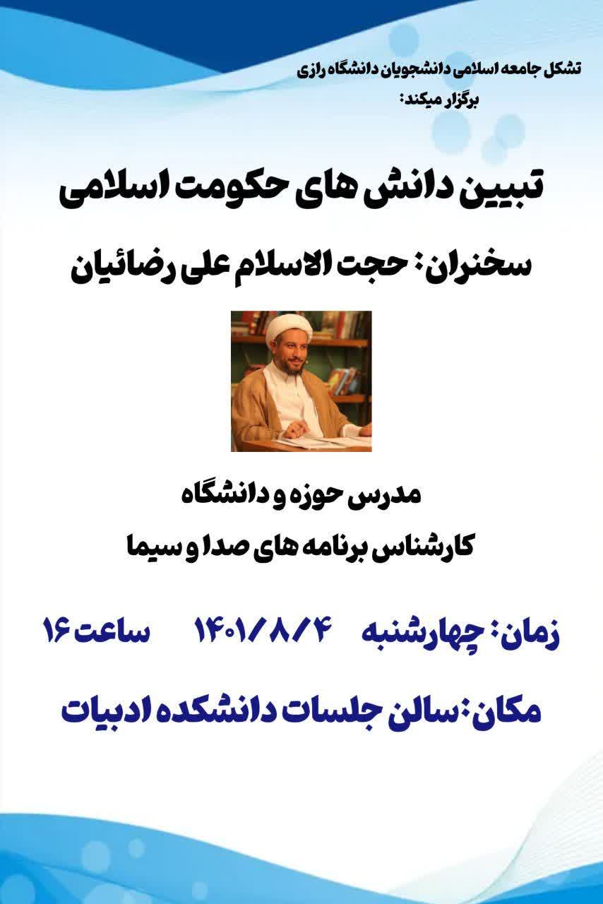 تشکل جامعه اسلامی دانشجویان دانشگاه رازی نشست هم اندیشی «تبیین دانش های حکومت اسلامی» را با سخنرانی حجتالاسلام علی رضائیان مدرس حوزه و دانشگاه و کارشناس صدا و سیما برگزار میکند.