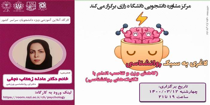 مرکز مشاوره دانشجویی دانشگاه رازی با همکاری کانون همیاران سلامت وبینار با عنوان لاغری به سبک روانشناسی"کاهش وزن و تناسب اندام با تکنیک های روانشناسی"در تاریخ چهارشنبه ۱۲ خرداد ماه ساعت ۱۹الی ۲۱ با تدریس خانم دکتر عادله ذهتاب نجفی دکترای روانشناسی ورزشی برگزار کرد که در ان تعریفی از ازدواج اگاهانه ارائه شد و در ان به بررسی نقش روانشناسی وخشم و استرس در چاقی و لاغری دلایل پرخوری،رژیم های محدود کننده و ...پرداخته شد.