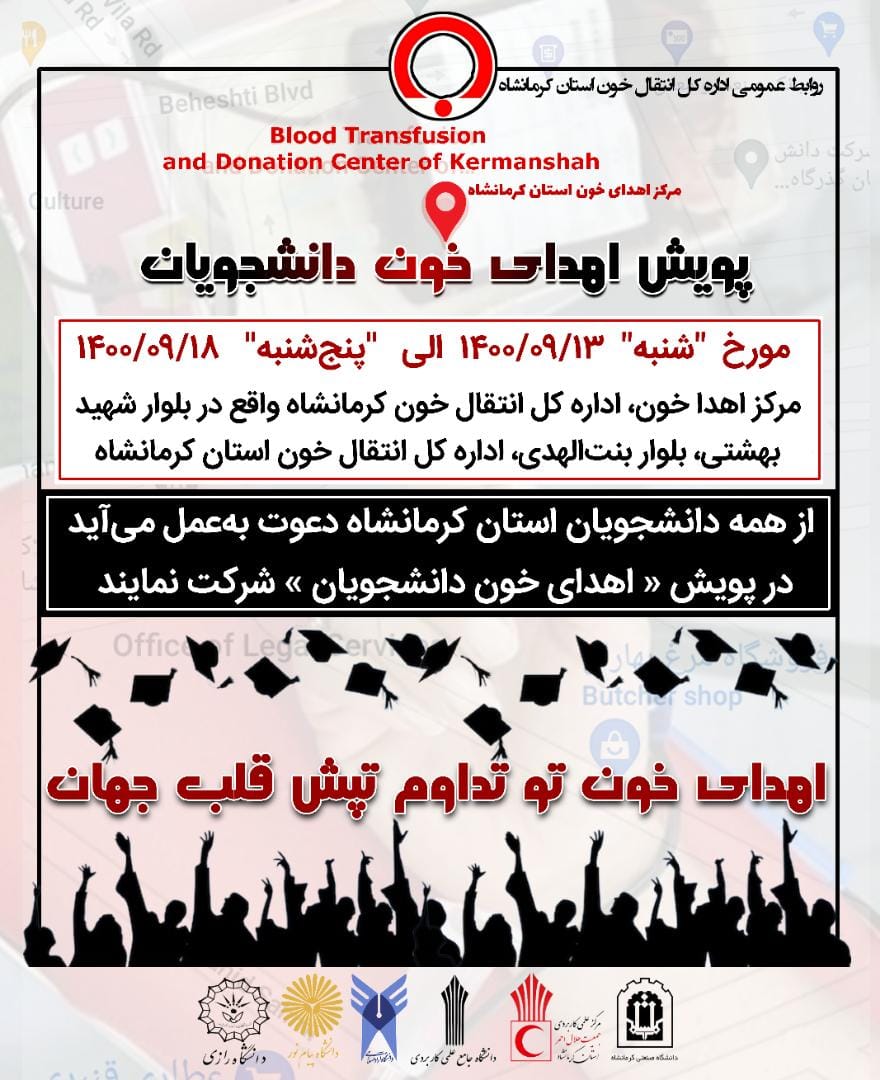 از همه دانشجویان استان کرمانشاه دعوت به عمل می آید در پویش «اهدای خون دانشجویان» شرکت نمایند.