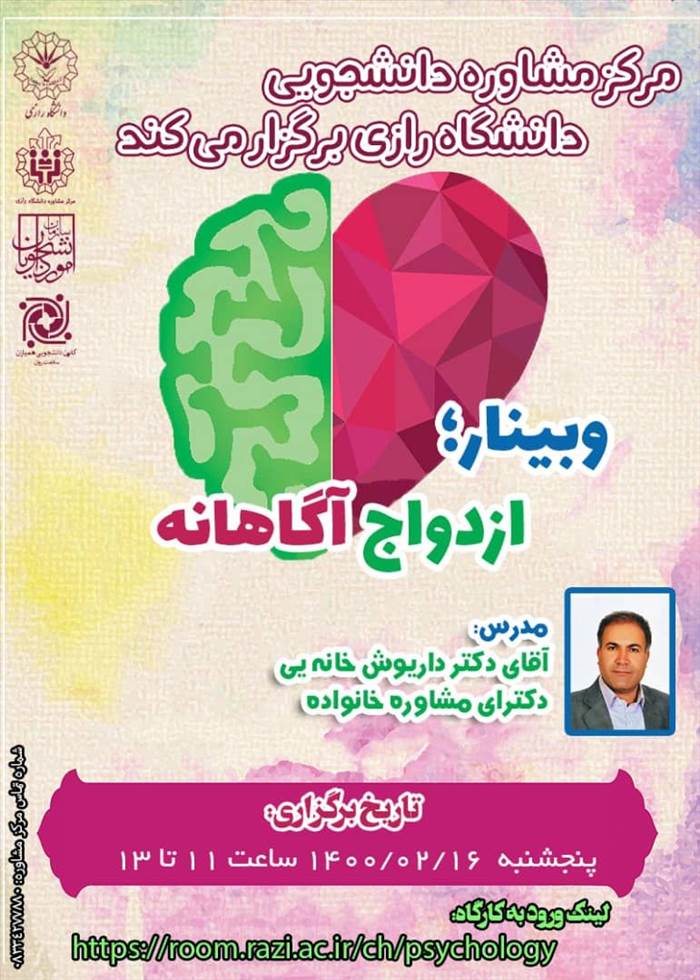 مرکز مشاوره دانشجویی دانشگاه رازی با همکاری کانون همیاران سلامت وبینار با عنوان "ازدواج اگاهانه"در تاریخ پنجشنبه ۱۶ اردیبهشت ماه ساعت ۱۱ الی ۱۳ با تدریس اقای دکتر داریوش خانه یی دکترای مشاوره خانواده برگزار کرد که در ان تعریفی از ازدواج اگاهانه ارائه شد و بررسی شد به چه ازدواجی اگاهانه گفته میشود و دانشجویان تشویق شدند که مهارت های لازم قبل از ازدواج را بیاموزند و ان ها را بکار ببیند تا ازدواج موفقی داشته باشند که با مشارکت خوب دانشجویان همراه بود.