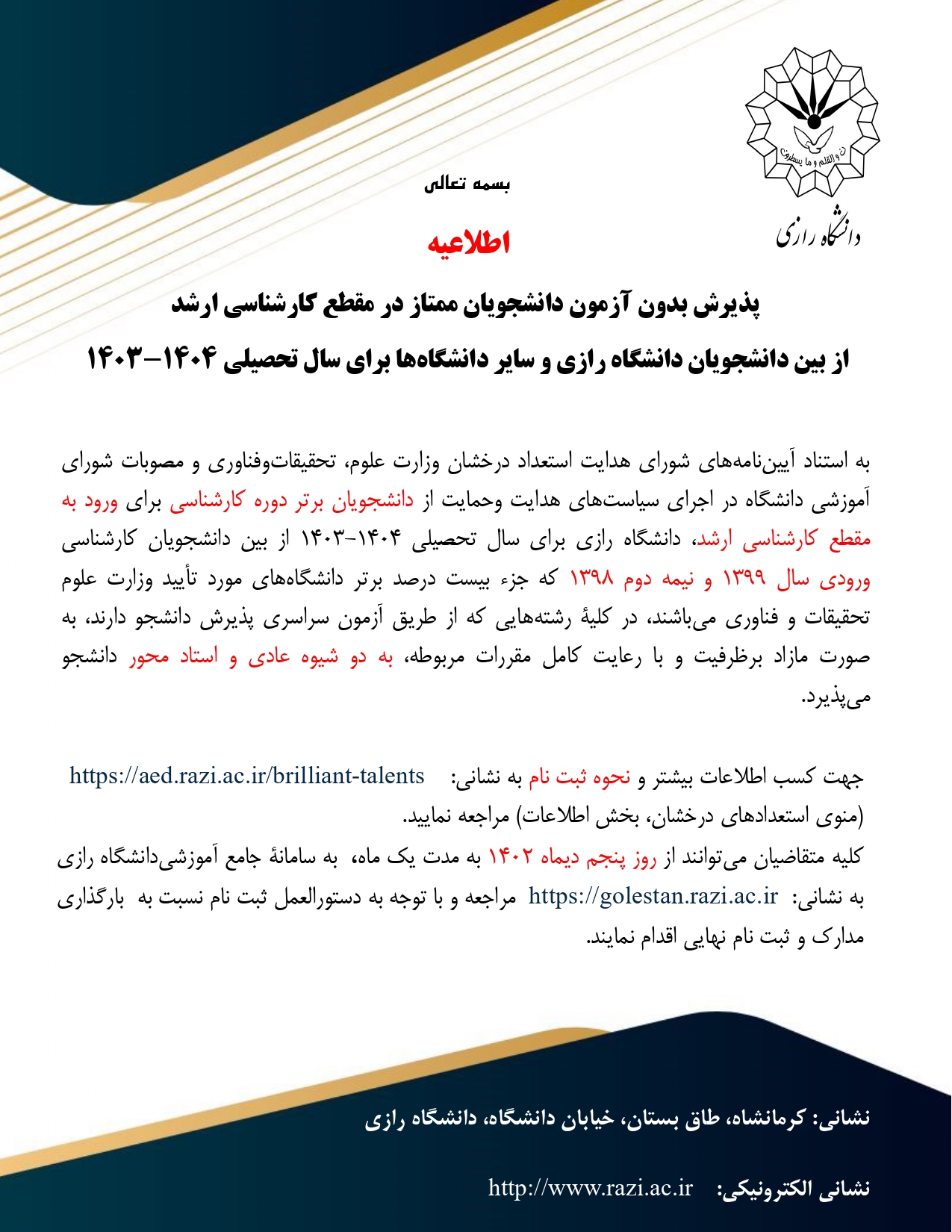دانشگاه رازی در اجرای سياستهای هدايت وحمايت از دانشجويان برتر برای ورود به مقطع كارشناسي ارشد با استناد به آيين نامه های شورای هدايت استعداد درخشان وزارت علوم، تحقيقات وفناوری، مصوبات شورای آموزشي دانشگاه، برای سال تحصيلي 1403-1404از بين دانشجويان ورودی سال 1399و وروديهای نيمسال دوم 1398كه جزء بيست درصد برتر دانشگاه رازی هستند و همچنين از ميان بيست درصد برتر ساير دانشگاههای مورد تأييد وزارت علوم، در كليۀرشته هايي كه از طريق آزمون سراسری پذيرش دانشجو دارد، به صورت مازاد برظرفيت و با رعايت كامل مقررات مربوطه، دانشجو ميپذيرد.
