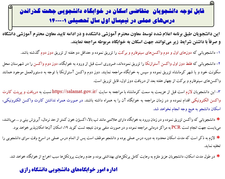 اطلاعیه شرایط اسکان در خوابگاههای دانشجویی جهت گذراندن دروس عملی نیمسال اول ۱۴۰۱-۱۴۰۰