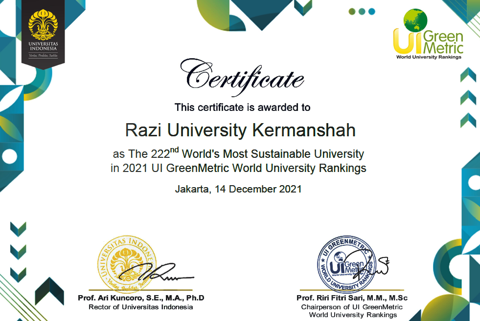 دانشگاه رازی کرمانشاه بار دیگرتوانست در بین دانشگاه های پایدار (سبز) دنیا در نظام رتبه بندی جهانی گرین متریک (world university UI Green Metric)  بدرخشد.