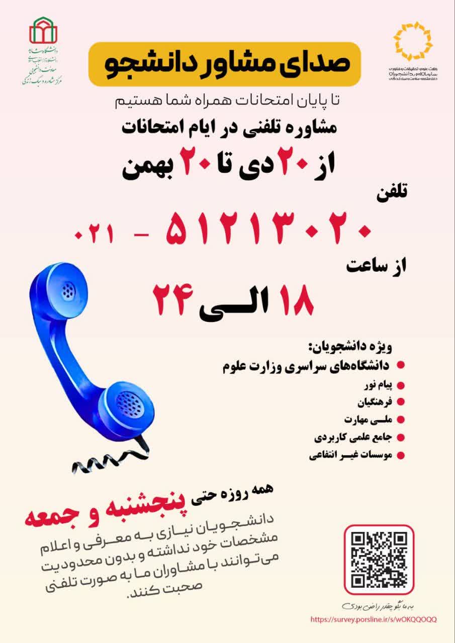 دانشجویان محترم میتوانند،‌ تا پایان امتحانات بدون محدودیت و بدون نیاز به معرفی با مشاوران ما بصورت رایگان  و تلفنی صحبت کنند.