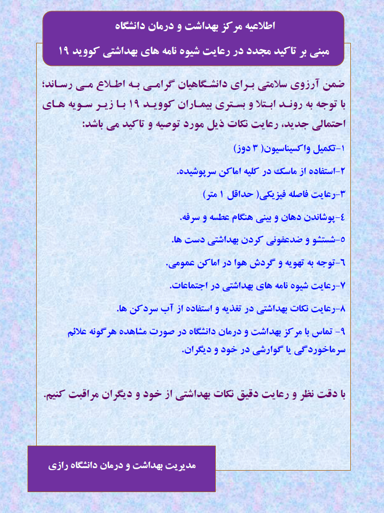 تاکید مجدد در رعایت شیوه نامه های بهداشتی کووید 19 - معاونت دانشجویی