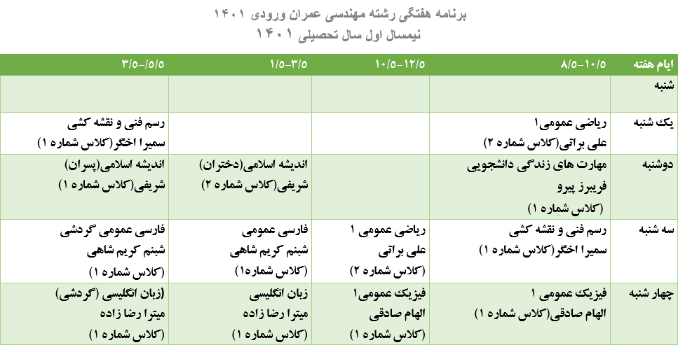 برنامه کلاسی نیمسال اول سال تحصیلی ۰2-۱۴۰1
