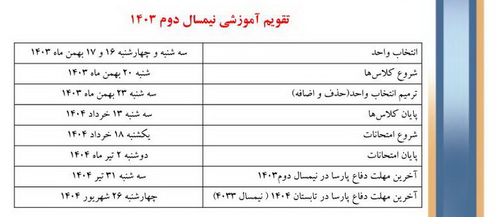 تقویم آموزشی نیمسال دوم سال تحصیلی ۱۴۰۴-۱۴۰۳ به شرح زیر است: