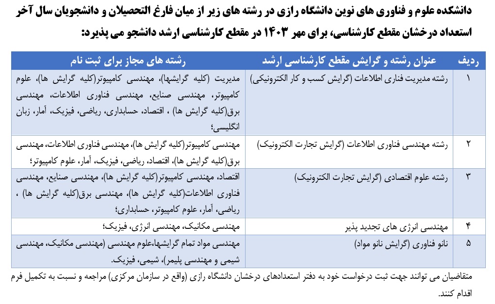 فراخوان پذیرش دانشجوی استعداد درخشان برای مقطع کارشناسی ارشد - دانشکده علوم و فناوریهای راهبردی