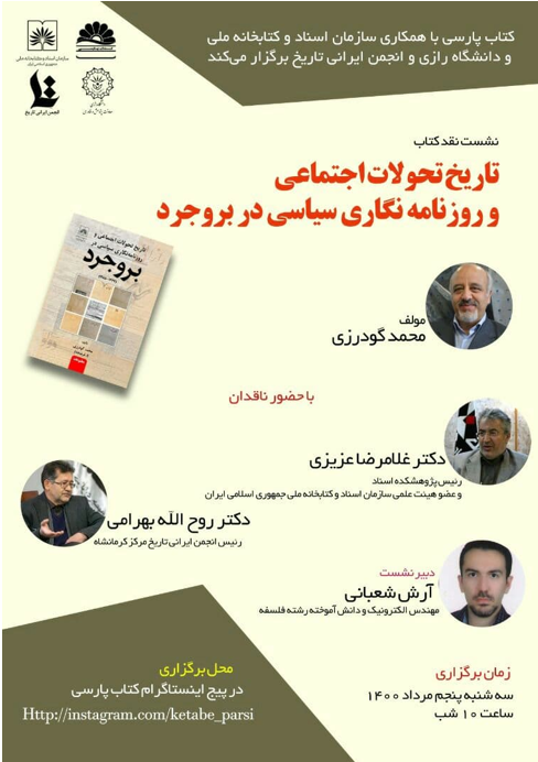 کتاب پارسی با همکاری سازمان اسناد و کتابخانه ملی و دانشگاه رازی و انجمن ایرانی تاریخ شعبه کرمانشاه برگزار میکند: جلسه نشست نقد کتاب « *تاریخ تحولات اجتماعی و روزنامه نگاری سیاسی در بروجرد»* با حضور نویسنده و ناقدان جلسه