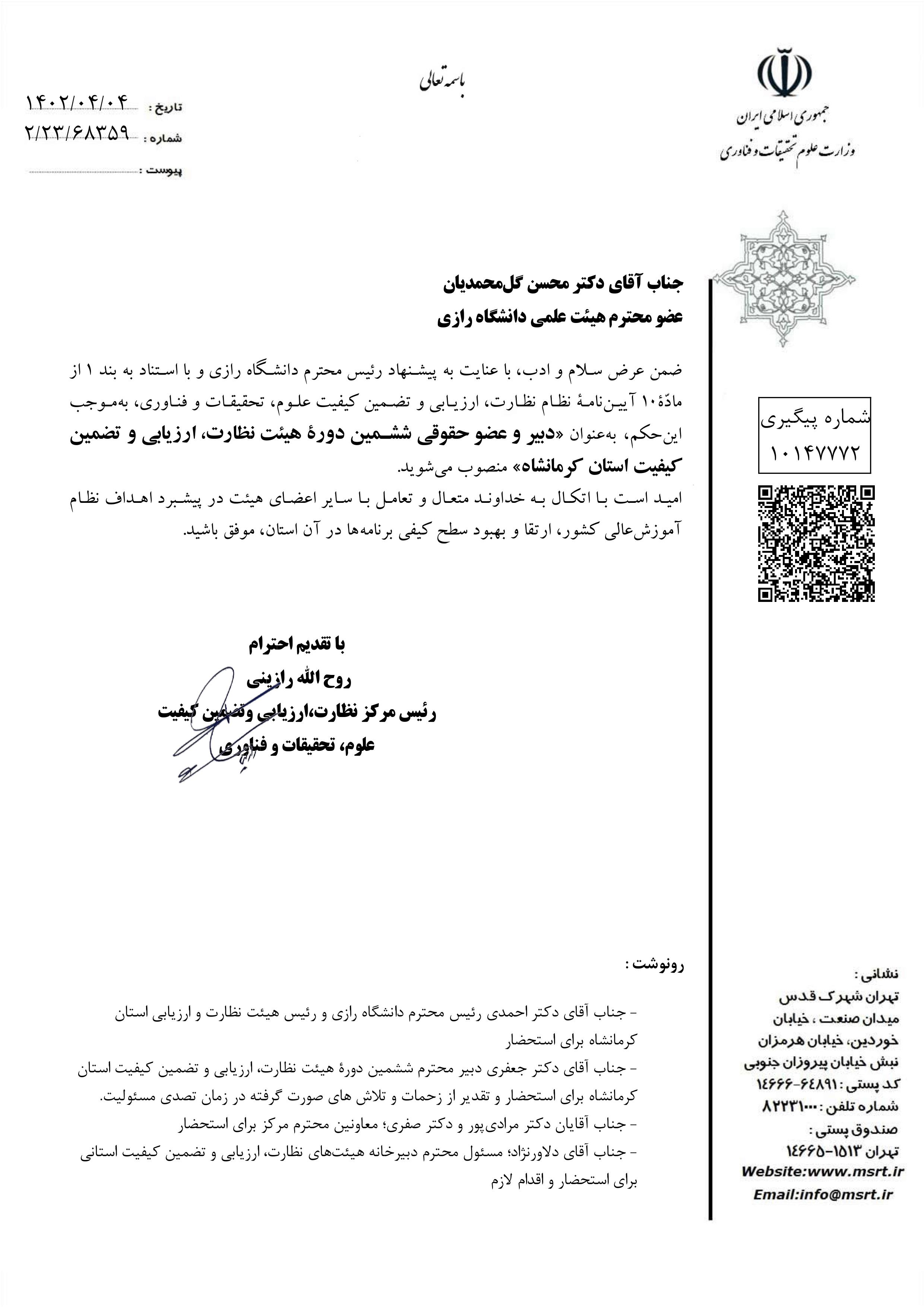 ضمن عرض سـلام و ادب، با عنایت به پیشنهاد رئیس محترم دانشگاه رازی و با اسـتناد به بند ۱ از ماده ۱۰ آیین‌نامه نظام نظارت، ارزیابی و تضمین کیفیت علوم، تحقیقات و فناوری، به موجب این حکم، به عنوان «دبیر و عضو حقوقی ششـمین دورة هیئت نظارت، ارزیابی و تضمین کیفیت استان کرمانشاه» منصوب می‌شوید. امید اسـت بـا اتکال بـه خداوند متعـال و تعامل بـا سایر اعضای هیئت در پیشـبرد اهـداف نظـام آموزش عالی کشور، ارتقا و بهبود سطح کیفی برنامه‌ها در آن استان، موفق باشید.
