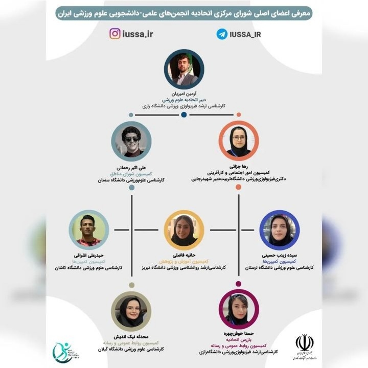 آقای آرمین امیریان، دانشجوی کارشناسی ارشد فیزیولوژی ورزشی دانشگاه رازی به عنوان دبیر اتحادیه علوم ورزشی و خانم حسنا خوش چهره، دانشجوی کارشناسی ارشد فیزیولوژی ورزشی دانشگاه رازی، به عنوان بازرس اتحادیه کمیسیون روابط عمومی و رسانه شورای مرکزی اتحادیه انجمن های علمی دانشجویی علوم ورزشی ایران انتخاب شدند.