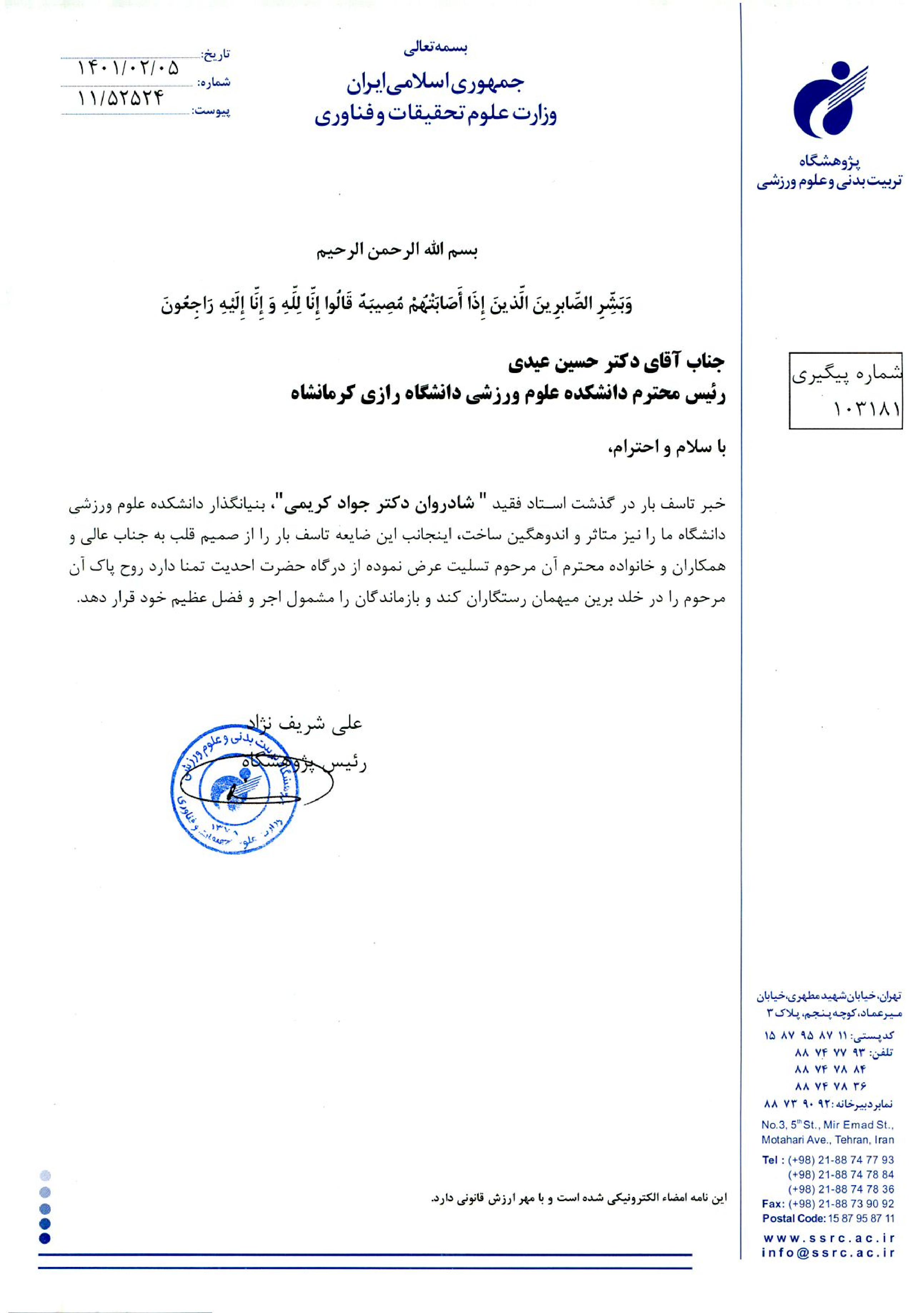 پیام تسلیت ریاست پژوهشگاه علوم ورزشی به مناسبت درگذشت دکتر جواد کریمی - دانشکده تربیت بدنی