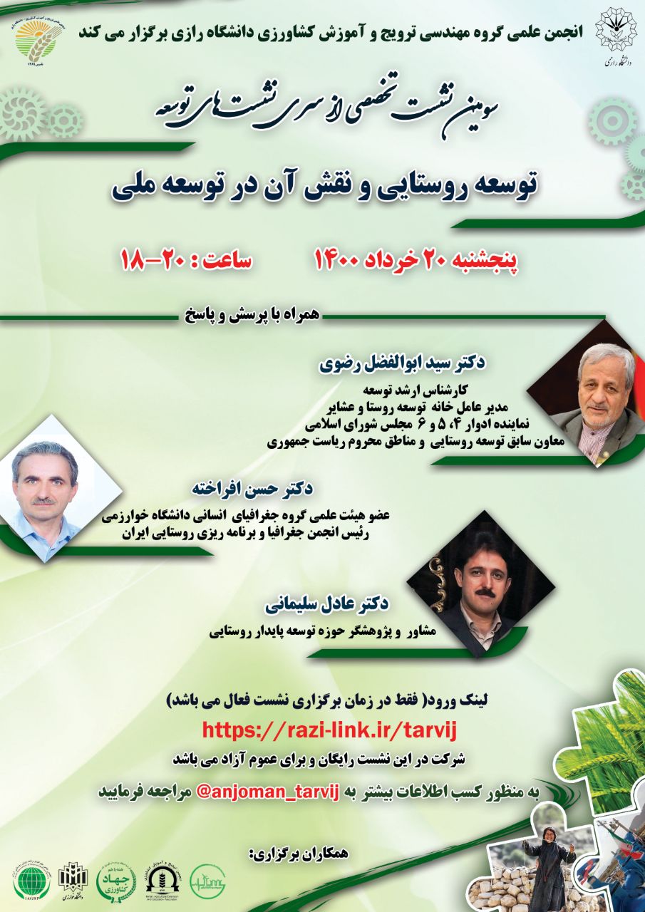 این نشست در تاریخ 20 خرداد 1400 با همکاری انجمن علمی گروه مهندسی ترویج و آموزش کشاورزی دانشگاه رازی و مرکز مدیریت سبز برگزار شد.