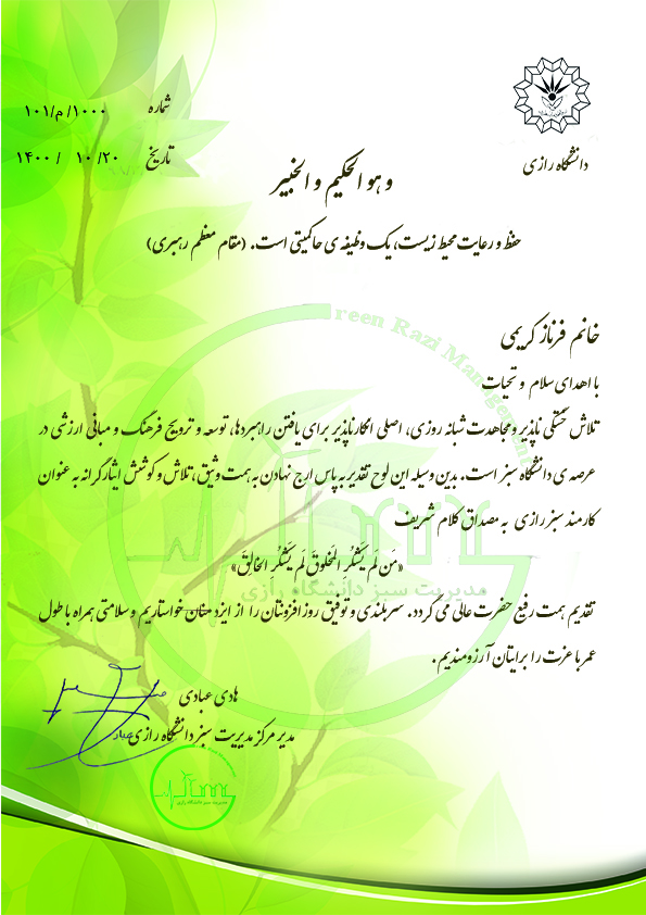 مدیریت سبز دانشگاه رازی کرمانشاه به منظور ترویج فرهنگ صرفه جویی و افزایش محیط سبز کارمندی ، اقدام به معرفی کارمند سبز در این دانشگاه نموده است .