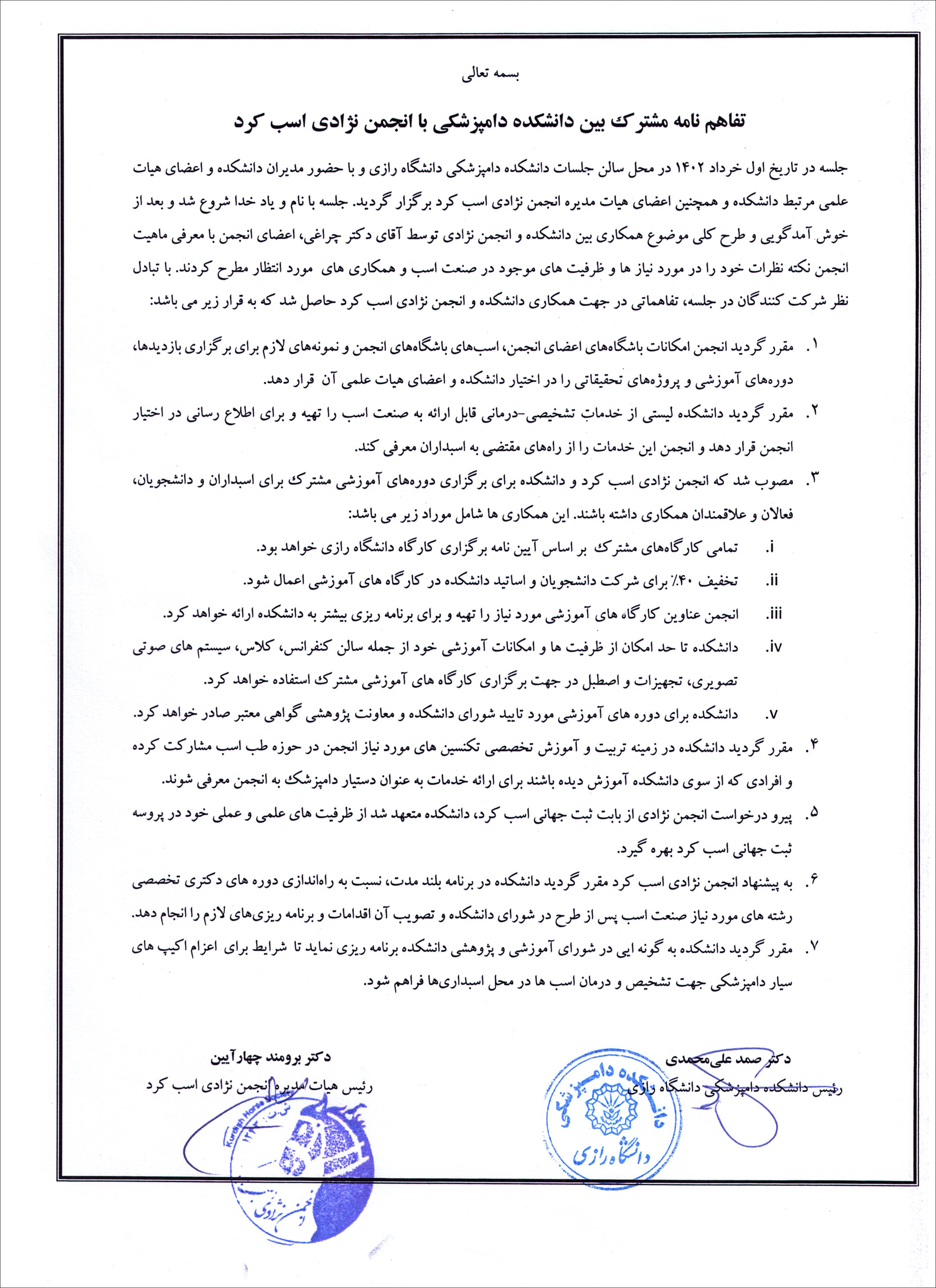 تفاهم نامه مشترک بین دانشکده دامپزشکی با انجمن نژادی اسب کرد