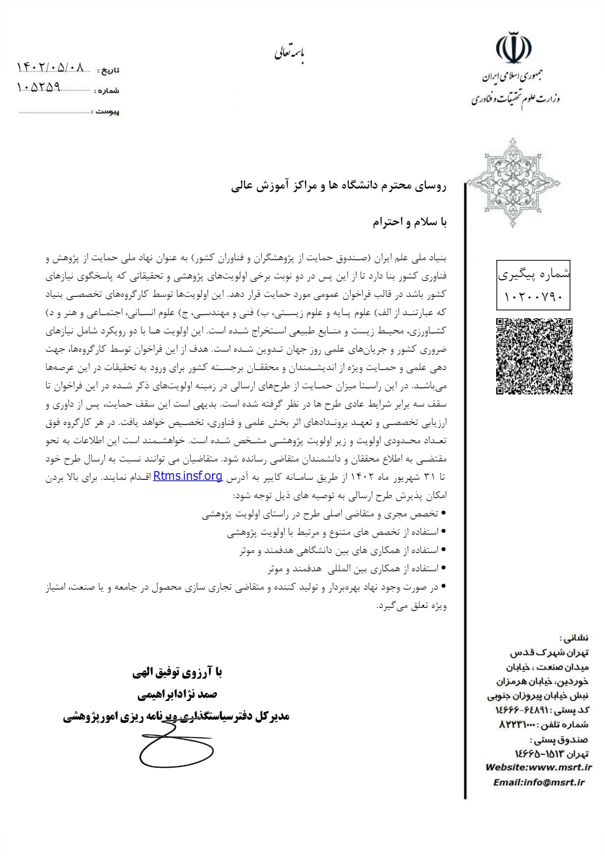 فراخوان حمایت از طرحهای پژوهشی - صندوق حمایت از پژوهشگران و فناوران کشور